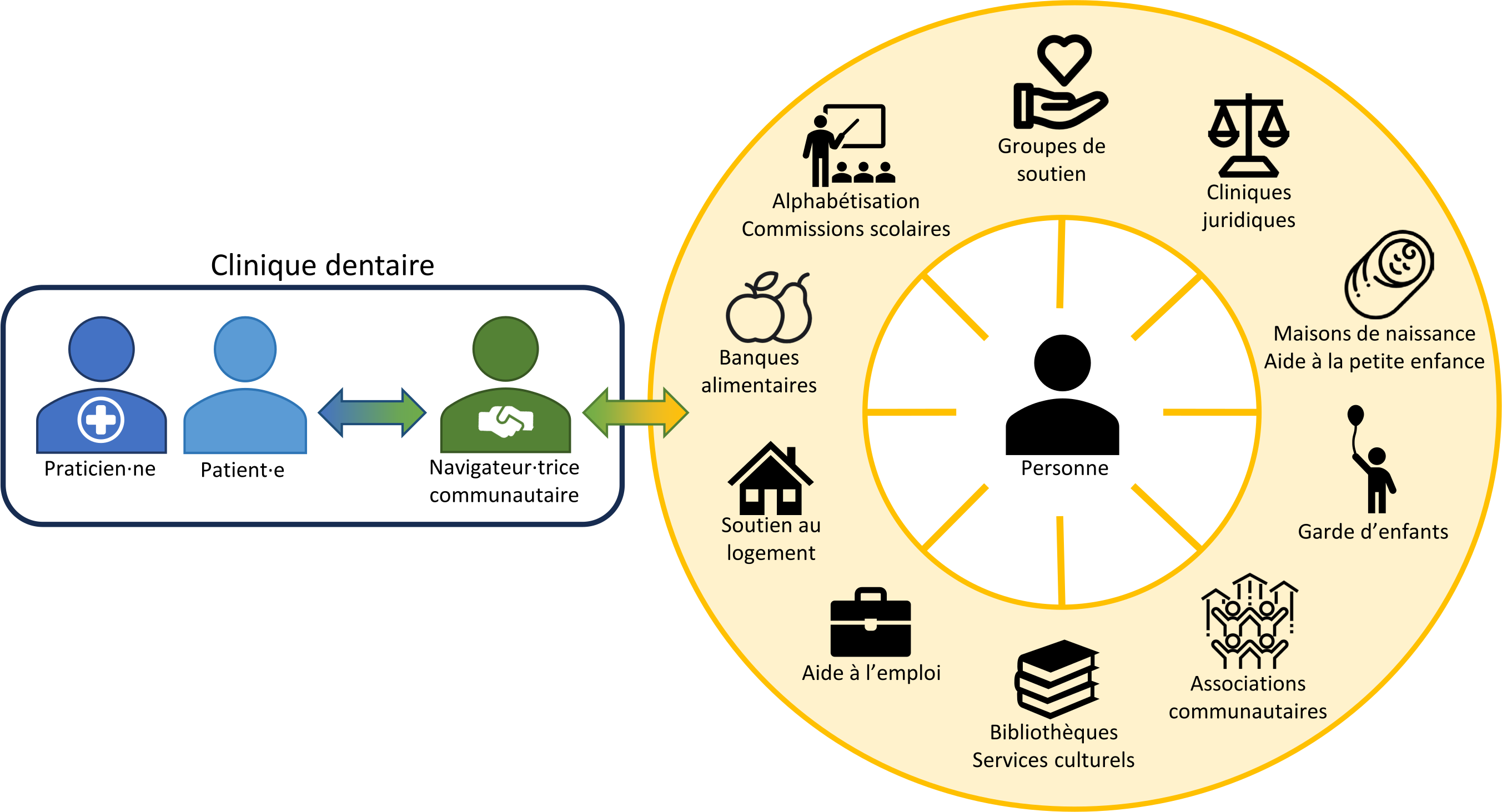 Pour assurer le relai avec les services psychosociaux locaux, les praticien·nes peuvent collaborer avec une personne qui assure un rôle de navigateur·trice communautaire. Il peut s’agir d’une personne désignée au sein de la clinique, ou d’une personne ressource dans la communauté, par exemple. Le ou la navigateur·trice communautaire peut contacter les organismes appropriés et assurer le suivi auprès des patient·es, des organismes et des professionnel·les.